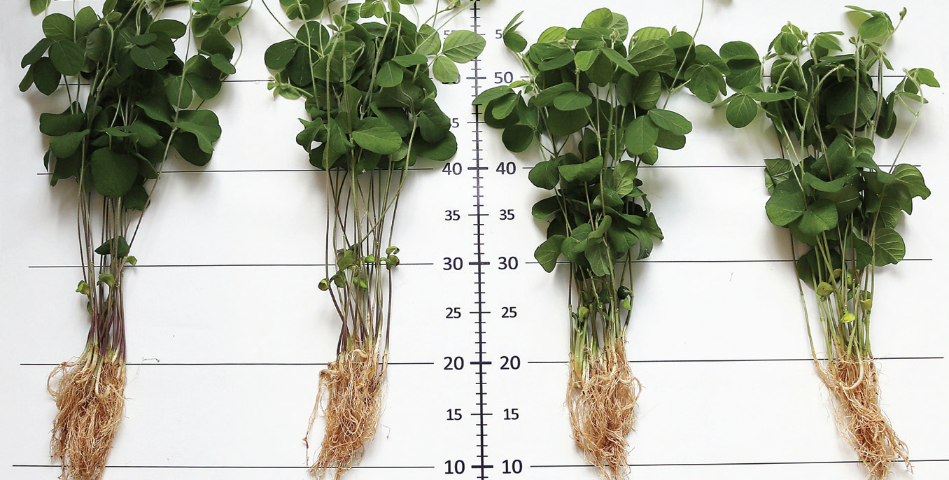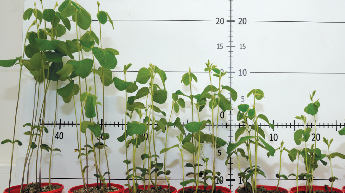 (Prva fotografija) Uticaj tretmana semena na rast i razvoj korena i nadzemnih delova soje: 1. Kontrola bez tretmana 2. Depozit, ME 1,2 l/t 3-4. Drugi preparati (Druga fotografija) Uticaj zaštitnog sredstva na dužinu vegetativnog dela biljke soje (retardantni efekat): 1. Kontrola bez obrade 2. Depozit - nema retardantnog efekta, ME 1,2 l/t 3-6. Drugi preparati